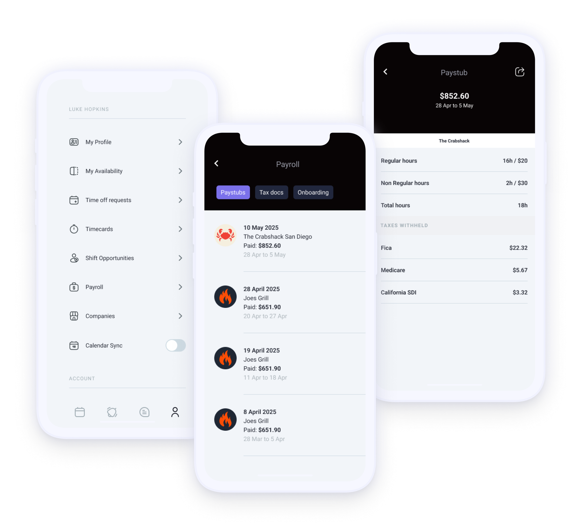 Employees can quickly view pay info, update details, and stay in control directly from the SocialSchedules app.